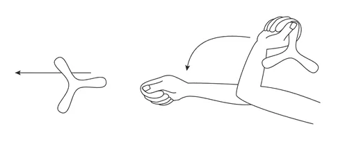 3) Ruku s bumerangem nahni co nejvíce k rameni (viz obrázek) a vrhni tak, abys mu zápěstím udělil co největší rotaci