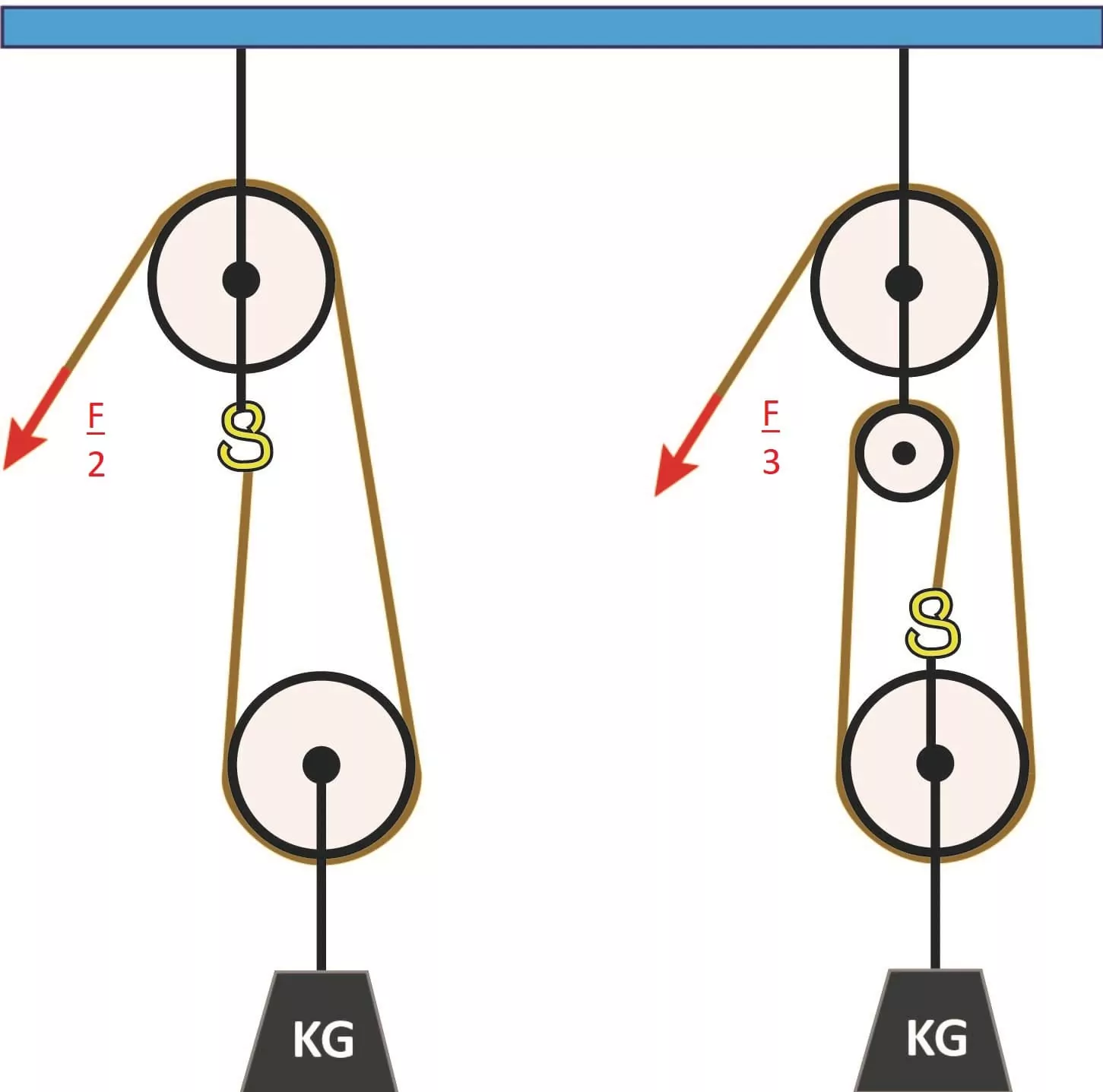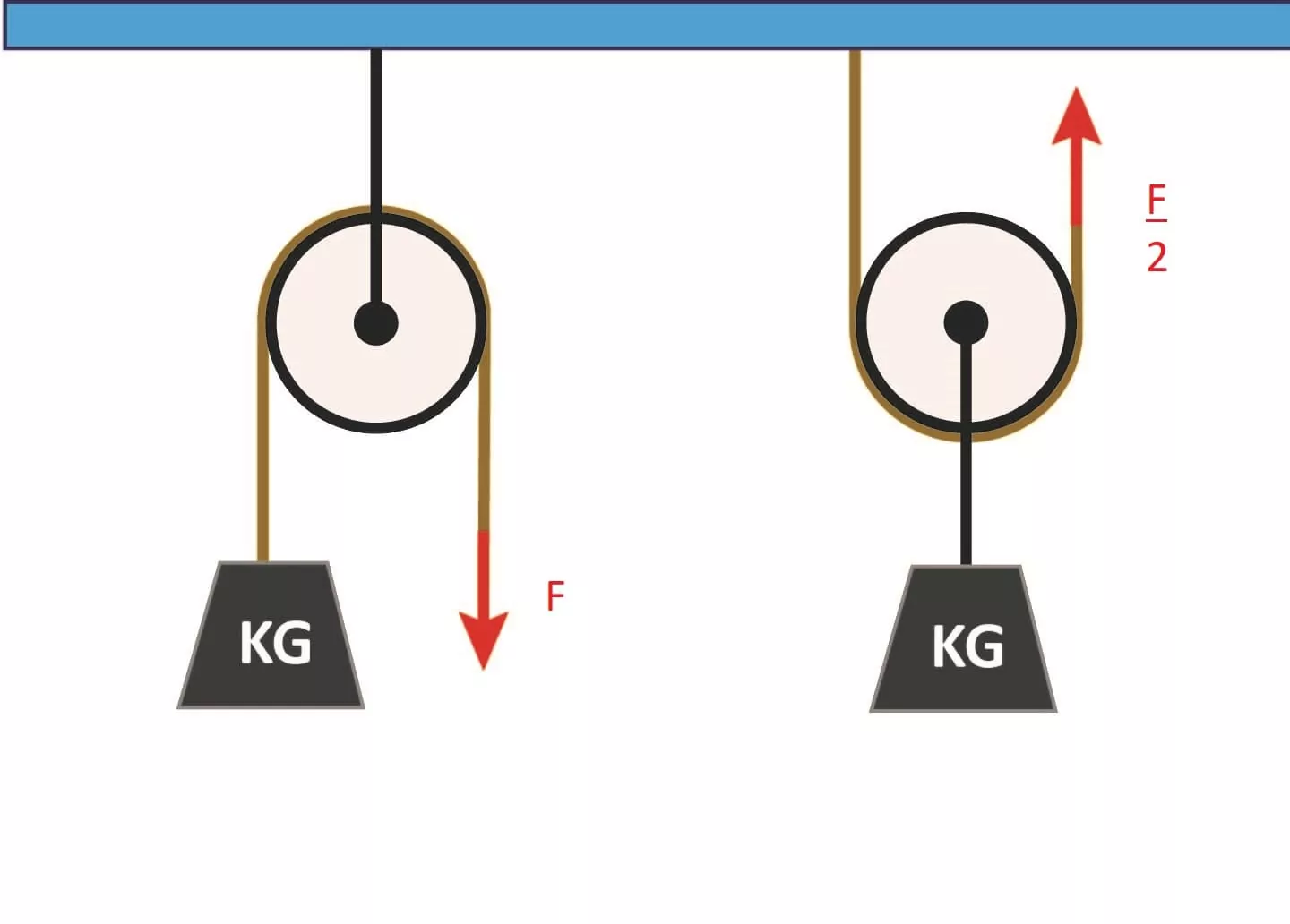 U volné kladky nám stačí síla poloviční, ale aby práce zůstala stále stejná, musíme zdvojnásobit dráhu, tzn. potáhnout provaz o 60 cm.
