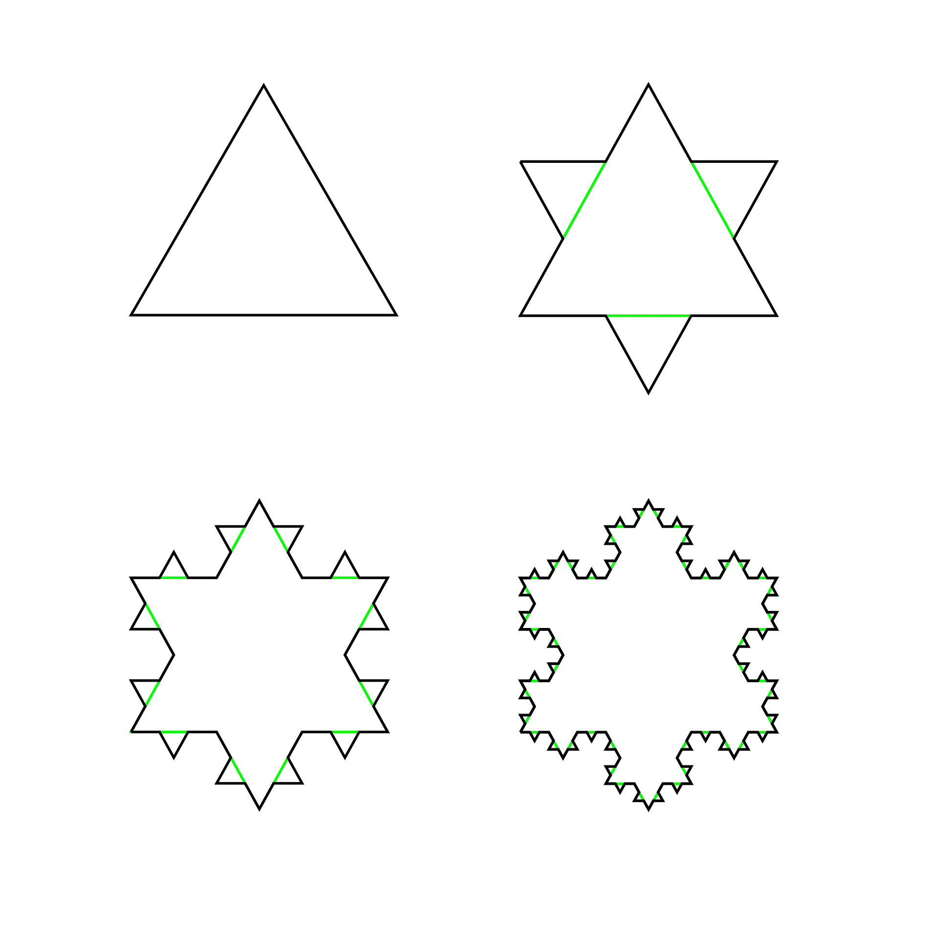 Jedním ze základních tvarů vyskytujících se ve fraktální geometrii je Kochova vločka, která byla poprvé popsána roku 1904. Na jejím tvaru si můžeme snadno vysvětlit princip vytváření fraktálů a vlastnost soběpodobnosti. Základem vločky je rovnostranný trojúhelník o délce jeden centimetr. Ke středům stran tohoto trojúhelníka připojíme další trojúhelníky zmenšené oproti předchozímu v poměru 1:3. K těmto trojúhelníkům připojíme další trojúhelníky opět zmenšené o jednu třetinu. Postupným opakováním tohoto postupu získáme členitý obrazec zvaný Kochova vločka.