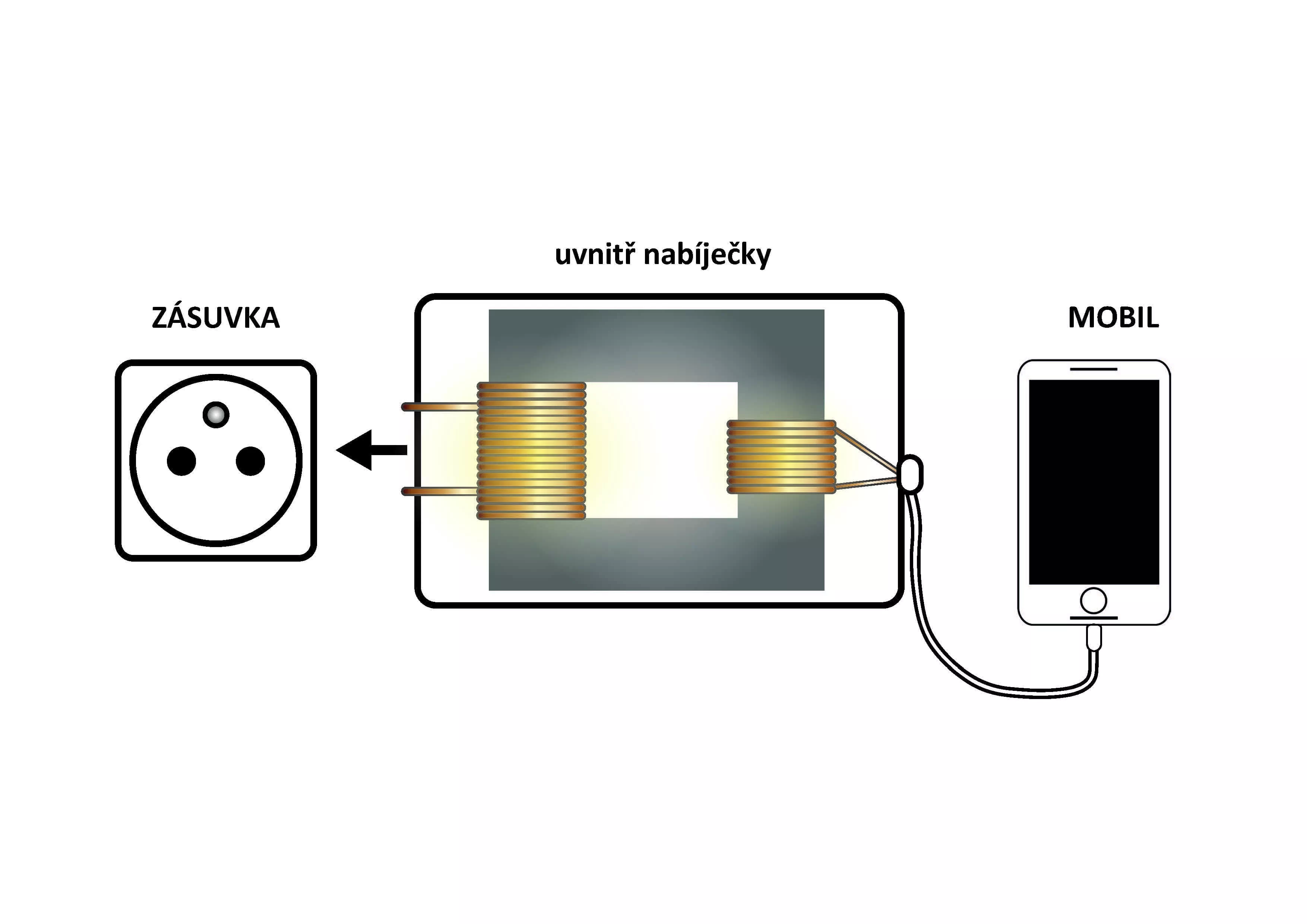 O transformátoru je dobré vědět, že ho tvoří dvě cívky na společném jádře. První cívka je připojena ke střídavému napětí ze zásuvky a vytváří pulzující magnetické pole. Druhá cívka reaguje na toto pulzující magnetické pole tím, že opět vytváří elektrické napětí, ale nižší než zásuvkové – a k tomuto nižšímu napětí máme připojený mobil či notebook.